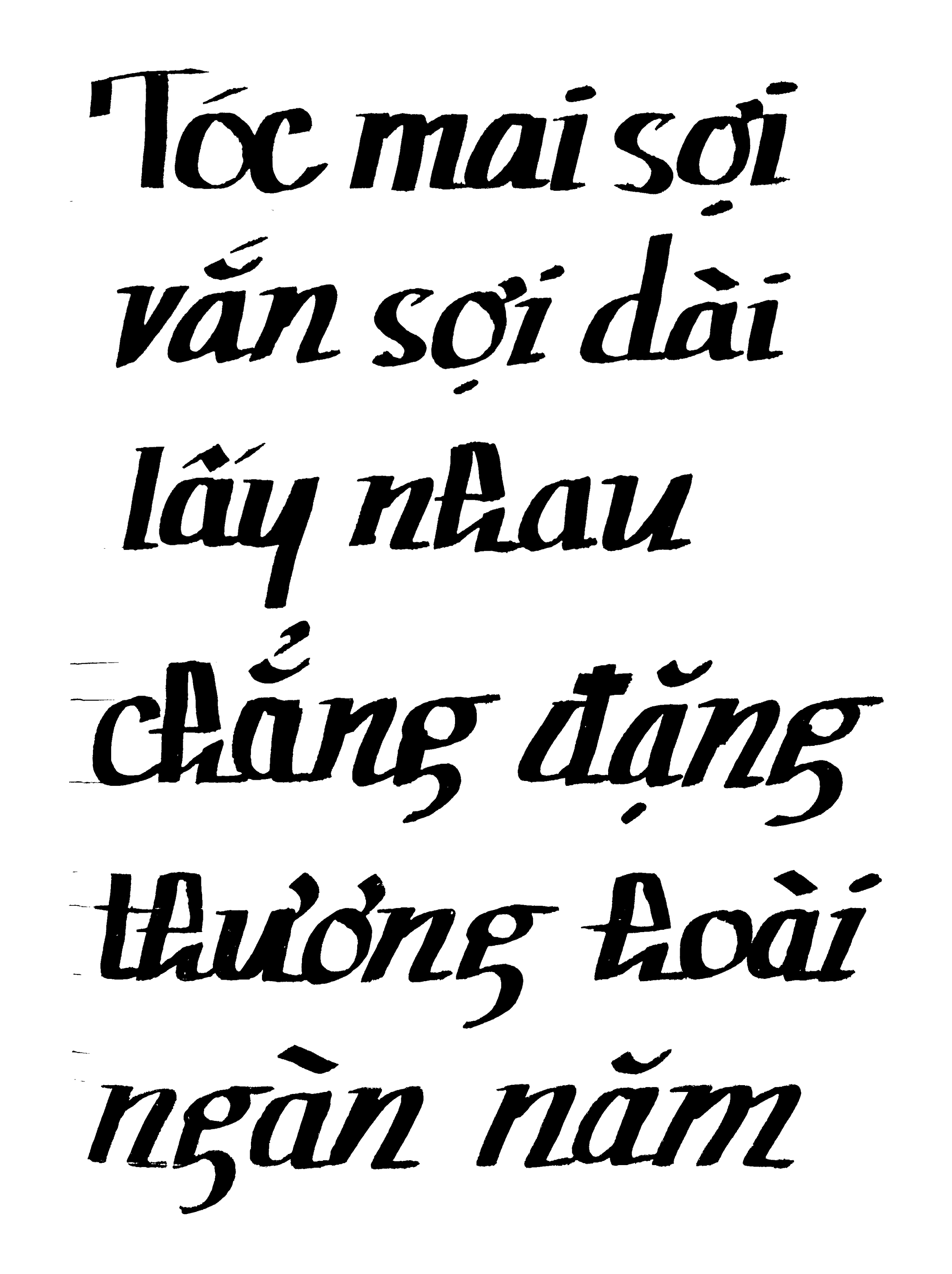The project began with collecting and studying midcentury Vietnamese songbooks and cover designs. I looked closely at how lettering was constructed in those prints, paying attention to the way strokes tapered, how diagonals met corners, and how titles filled tight spaces on the page. To better understand stroke contrast, I rewrote several letterforms using different tools, including a flat calligraphy brush and a fountain pen. This helped me observe how thick and thin strokes form through hand movement. Early sketches explored structure and proportion before moving into Glyphs. Each character was then drawn and refined with careful attention to spacing and overall balance. The diacritics were positioned so tone marks sit comfortably with the letterforms and remain clear at display sizes. The typeface was refined as a display design intended for headlines, posters, and signage.